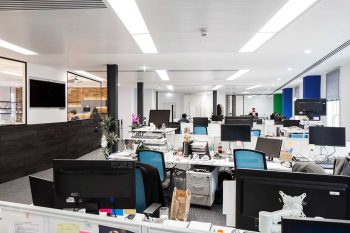 A carefully curated soft colour carpet scheme enhances the overall aesthetic. A deep grey tone flows through the main open-plan space, while navy blue defines the private offices. A bright accent beneath the boardroom table adds a creative touch. In the reception and teapoint areas, oak-effect vinyl flooring was chosen to complement the carpet tones and bring warmth to the space.